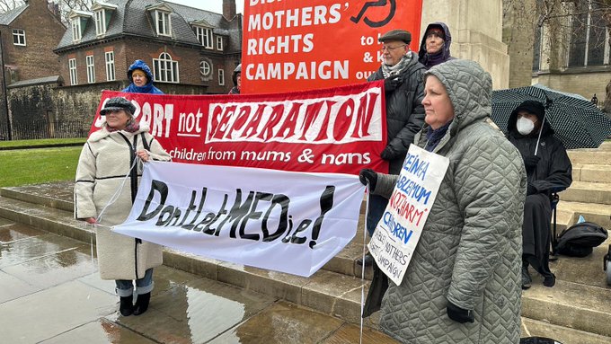 A group of ME campaigners held a protest outside parliament on 8 March, 2023. Another slogan was “Support not Separation”, a reference to the practice of misdiagnosing children who in fact have ME/CFS with fabricated or induced illness (FII), which results in the children being taken into care.
